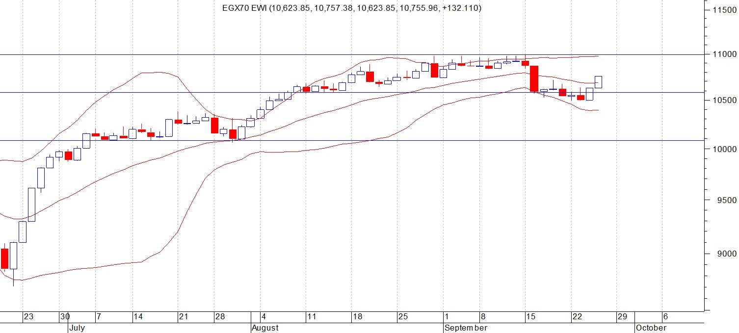 أغلق المؤشر العام EGX70 عند مستوى 10755 نقطة نتوقع ان يتحرك المؤشر عرضيا بين مستوى 10500 ومستوى 11000 اذا استطاع السوق الثبات فوق هذه المقاومة فانه يتجه الى 11300 ثم 11500 في الاجل القريب ان شاء الله والا فالدعوم هي 10500 ثم 10000ويعتبر مستوى 10500 هو مستوى وقف الخسارة في حال اختراقه لاسفل.