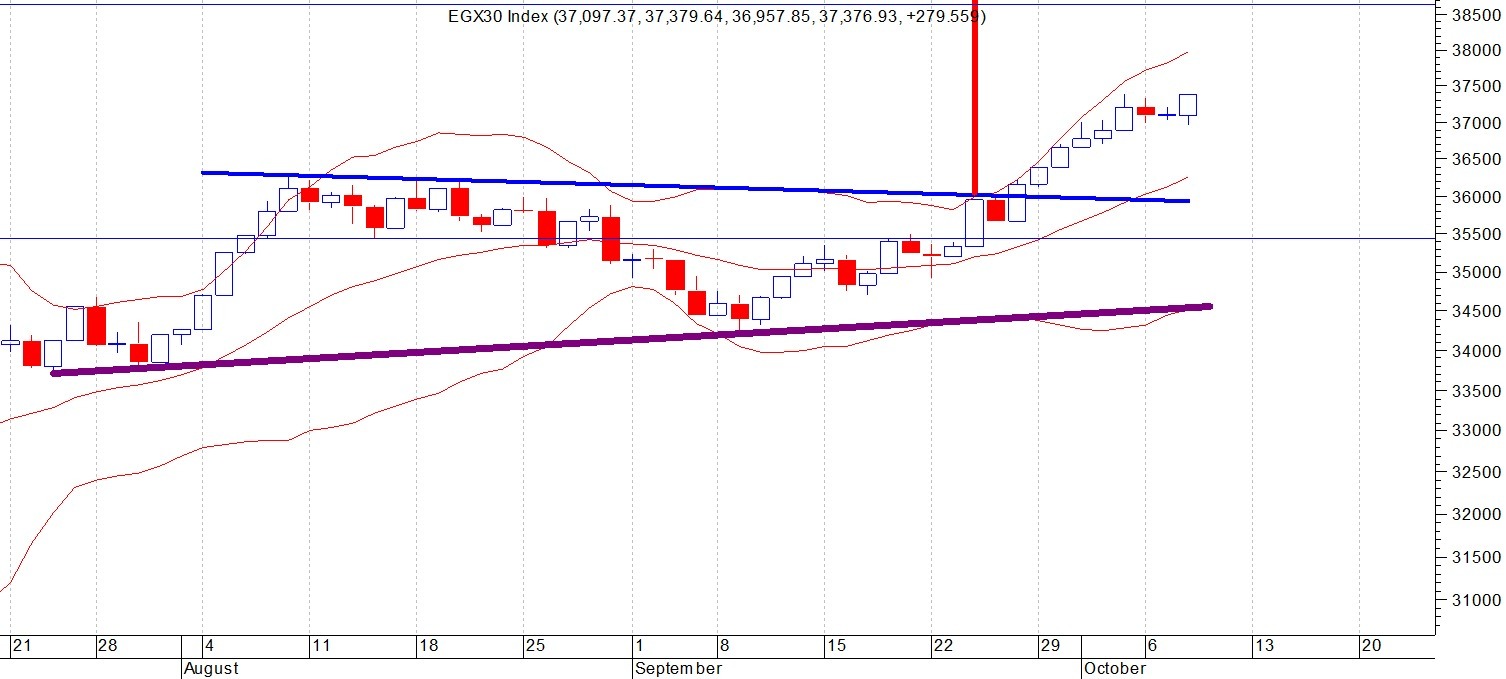 أغلق المؤشر العام EGX30 عند مستوى 37376 ويتحرك المؤشر العام في اتجاه صاعدمستهدفا 38500 في الاجل القريب ان شاء الله بعد اختراقه نموذج المثلث المتماثل عند مستوى36000 وكذلك اختراقه للمقاومة التاريخية السابقة عند 36282 ويعتبر مستوى 37000 هو مستوى الدعم القريب عند اي تصحيح للمؤشر ومستوى 36700 هو مستوى وقف الخسارة في حال اختراقه لاسفل.