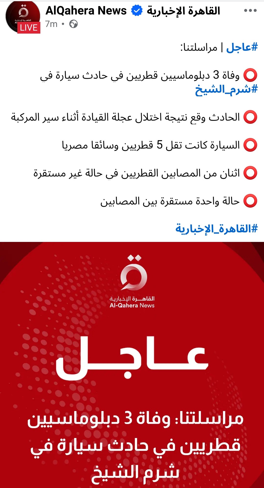 القاهرة الإخبارية: وفاة 3 دبلوماسيين قطريين بحادث سير بشرم الشيخ