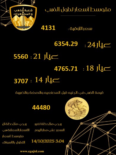 سجلت أسعار الذهب، ارتفاع ملحوظ في منتصف تعاملات اليوم الثلاثاء، حسبما ذكرت الشعبة العامة للذهب والمجوهرات بالاتحاد العام للغرف التجارية.