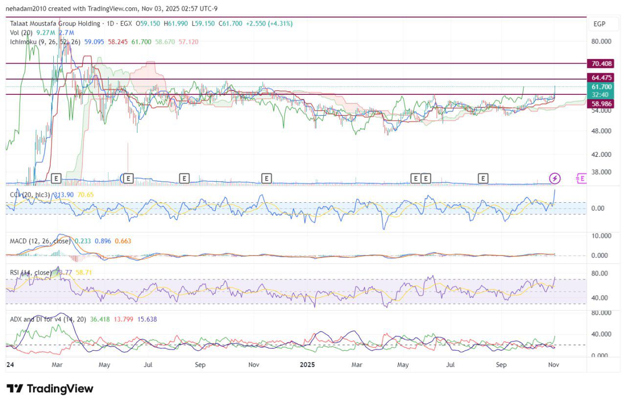 يتداول السهم حالياً حول سعر 61.700 جنيه، وقد أظهر التحليل الفني للسهم على الإطارين اليومي والأسبوعي مؤشرات إيجابية قوية تدعم حركة السعر: