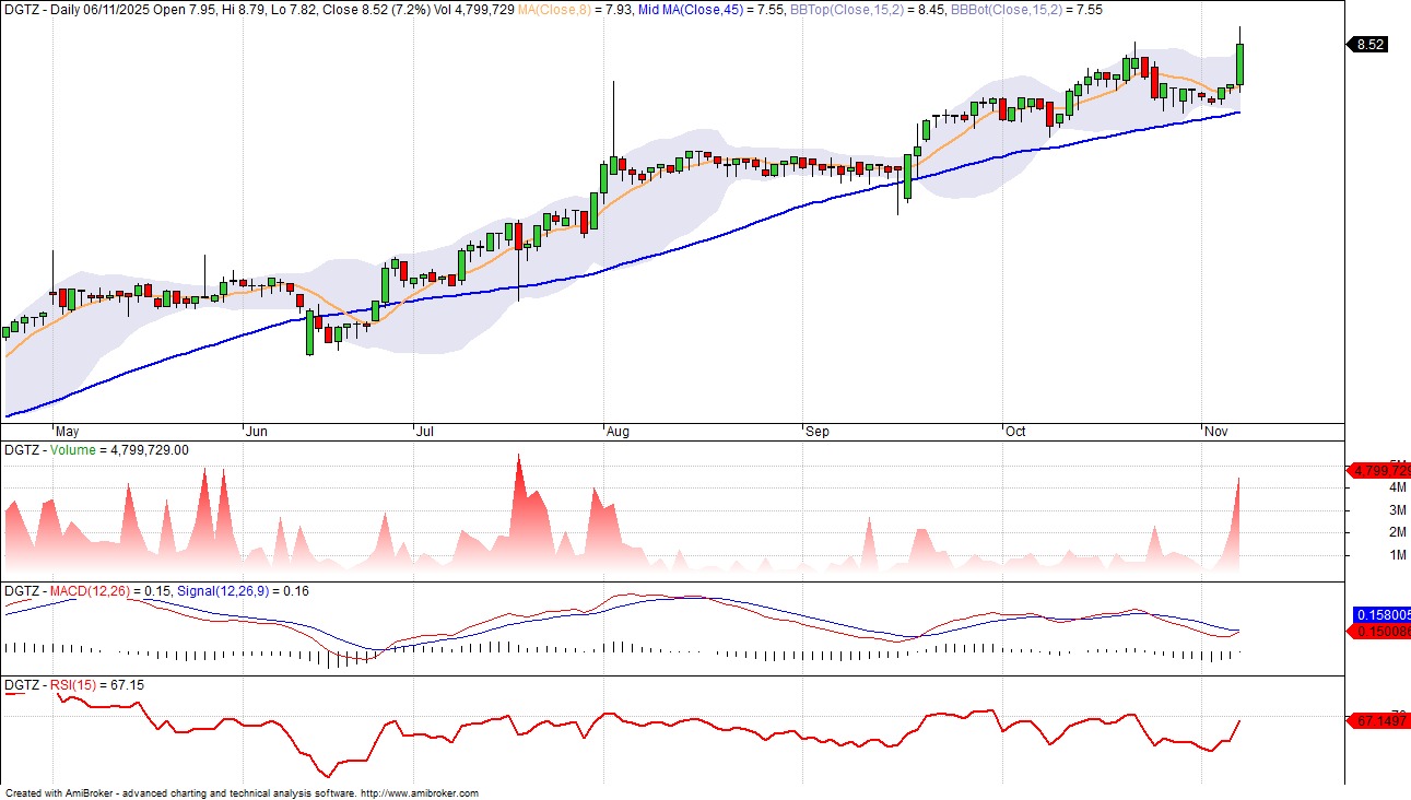 حاول سهم ديجيتايز، خلال تعاملات الاسبوع الماضى إختراق مستوى المقاومة 8.60 ج، دون تمكنه من ذلك حيث وصل لمستوى 8.79 ج، لينهى جلسات الاسبوع عند مستوى 8.52 ج، وتظل الرؤية إيجابية للسهم مادام يتحرك أعلى مستوى 7.50 ج، ويجد السهم أقرب مستوى دعم عند 8.00 ج، ويتحرك السهم فى إتجاه صاعد فى المدى القصير والمتوسط.