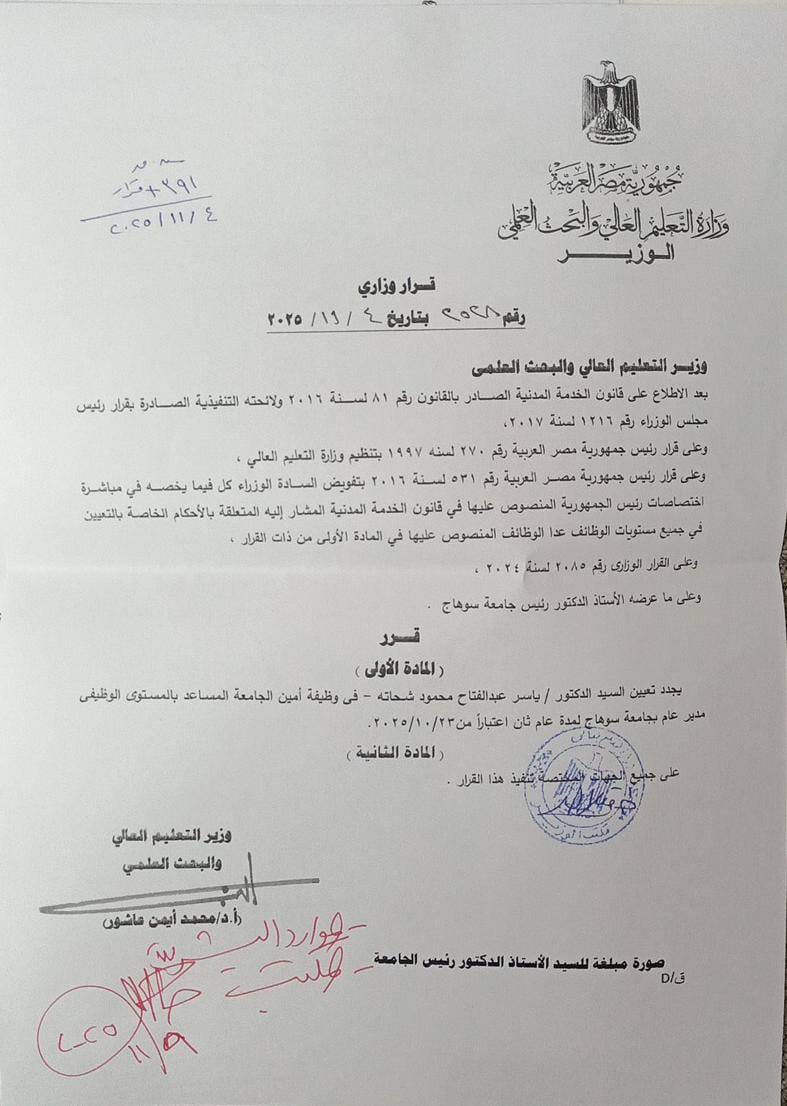 ويأتي هذا القرار بناءً على القرار الوزاري رقم 652 بتاريخ 2025/10/9 الصادر من وزير التعليم العالي والبحث العلمي، والذي نص على تجديد التعيين لمدة عام ثانٍ.