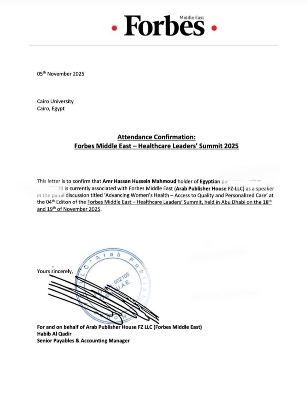 أعلن الدكتور حسام صلاح، عميد كلية طب قصر العيني ورئيس مجلس إدارة المستشفيات الجامعية بجامعة القاهرة، مشاركة الدكتور عمرو حسن، أستاذ أمراض النساء والتوليد بكلية طب قصر العيني ومقرر المجلس القومي للسكان السابق، كمتحدث رسمي في قمة قادة الرعاية الصحية لمنطقة الشرق الأوسط التي تنظمها Forbes Middle East يومي 18 و19 نوفمبر 2025 بقصر الإمارات في أبوظبي. ويأتي هذا الإعلان في إطار حرص الكلية على دعم حضورها العلمي في الفعاليات الإقليمية البارزة، وتعزيز دور أساتذتها في الملتقيات التي تناقش مستقبل نظم الرعاية الصحية.