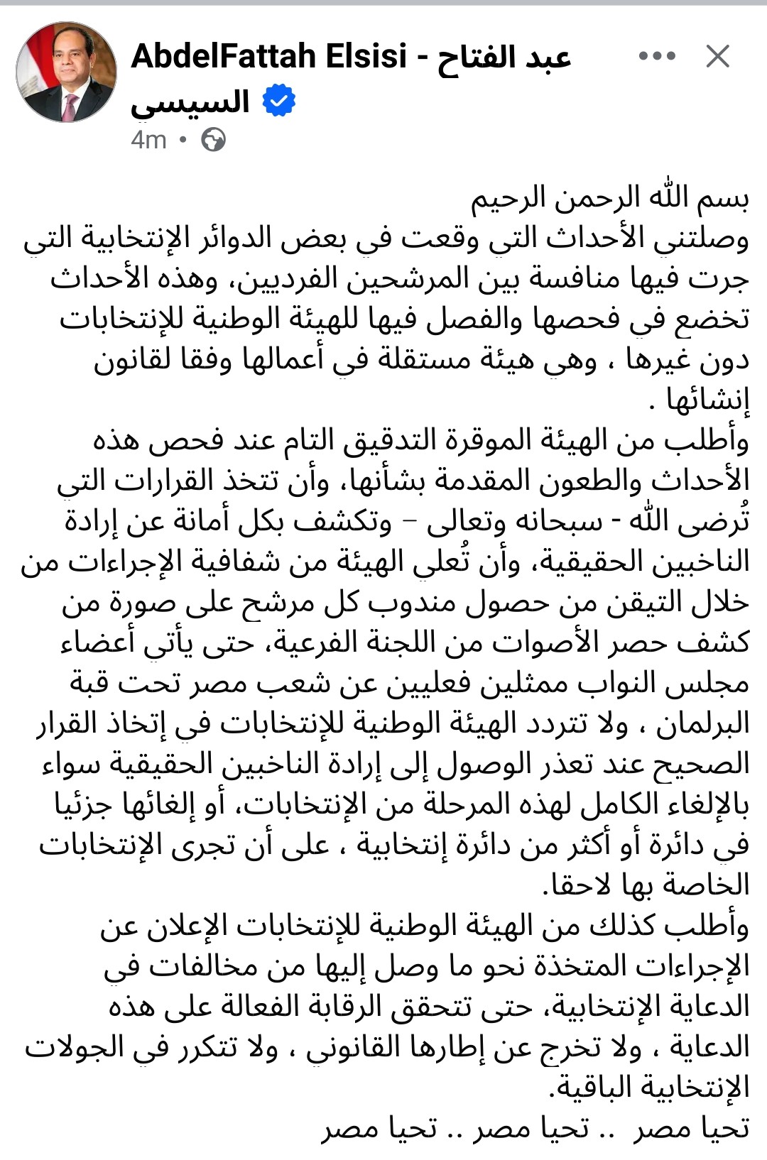 وطالب الرئيس السيسي، من الهيئة الموقرة التدقيق التام عند فحص هذه الأحداث والطعون المقدمة بشأنها، وأن تتخذ القرارات التي تُرضى الله – سبحانه وتعالى-:وتكشف بكل أمانة عن إرادة الناخبين الحقيقية، وأن تُعلي الهيئة من شفافية الإجراءات من خلال التيقن من حصول مندوب كل مرشح على صورة من كشف حصر الأصوات من اللجنة الفرعية، حتى يأتي أعضاء مجلس النواب ممثلين فعليين عن شعب مصر تحت قبة البرلمان، ولا تتردد الهيئة الوطنية للإنتخابات في إتخاذ القرار الصحيح عند تعذر الوصول إلى إرادة الناخبين الحقيقية سواء بالإلغاء الكامل لهذه المرحلة من الإنتخابات، أو إلغائها جزئيا في دائرة أو أكثر من دائرة إنتخابية، على أن تجرى الإنتخابات الخاصة بها لاحقا.