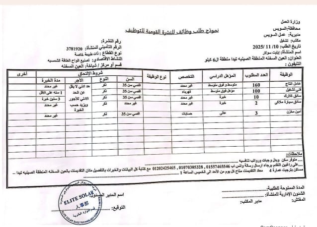 في إطار تنفيذ توجيهات وزير العمل، محمد جبران، بتوفير فرص عمل لائقة للشباب، وتعزيز فرص التشغيل داخل المشروعات الصناعية، أعلنت وزارة العمل اليوم، عن توفير 275 فرصة عمل جديدة لأبناء محافظة السويس، وذلك للعمل بشركة “إيليت سولار” العاملة في مجال الصناعات والتقنيات المرتبطة بالطاقة.