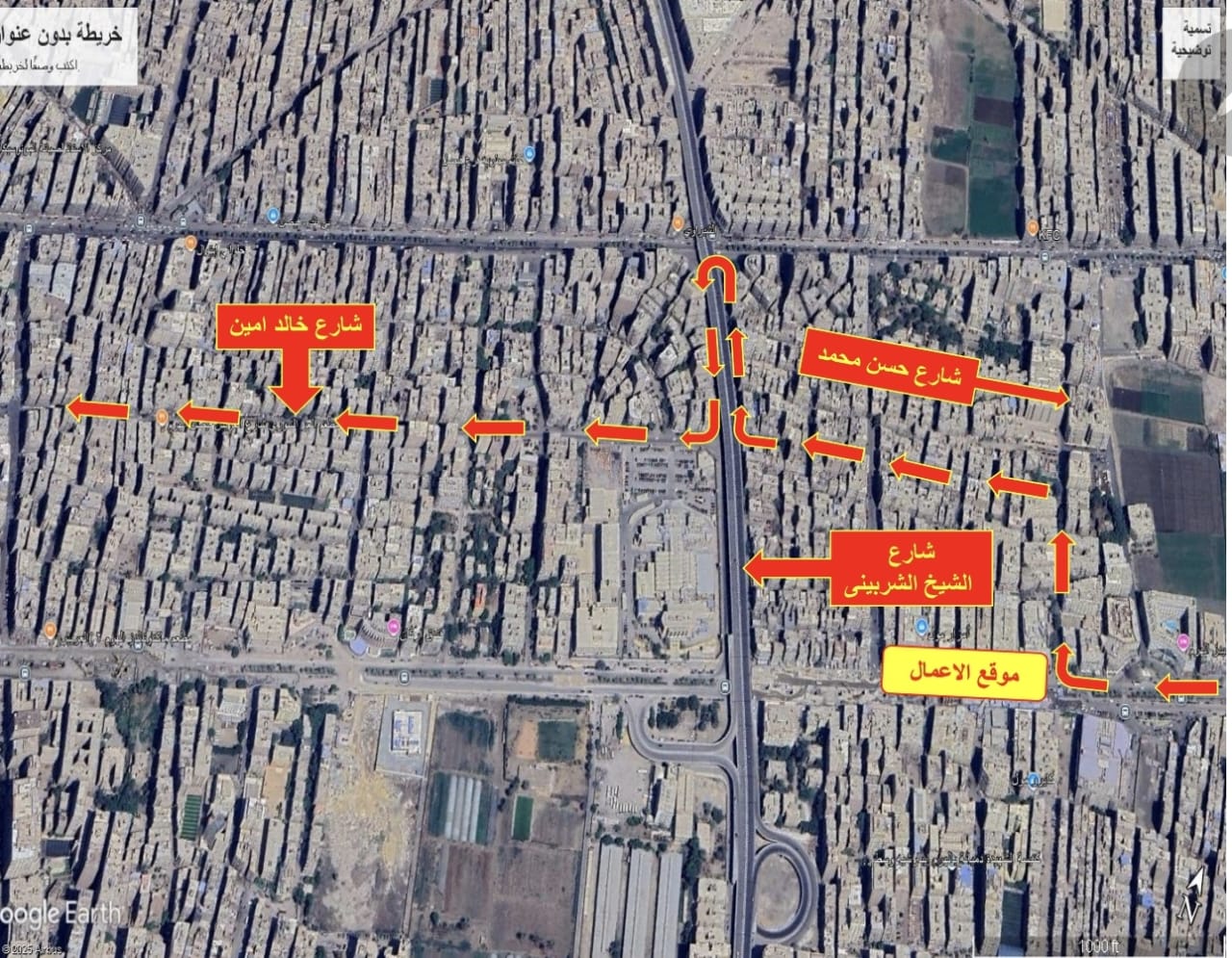 حركة المركبات بشارع الأهرام القادمة من ميدان الجيزة والراغبة في استكمال السير باتجاه المنطقة الأثرية وميدان الرماية: تتجه يمينًا إلى شارع حسن محمد، ثم يسارًا إلى شارع الليثي، ثم استكمال السير باتجاه شارع الخليل إبراهيم وصولًا إلى شارع العريش.