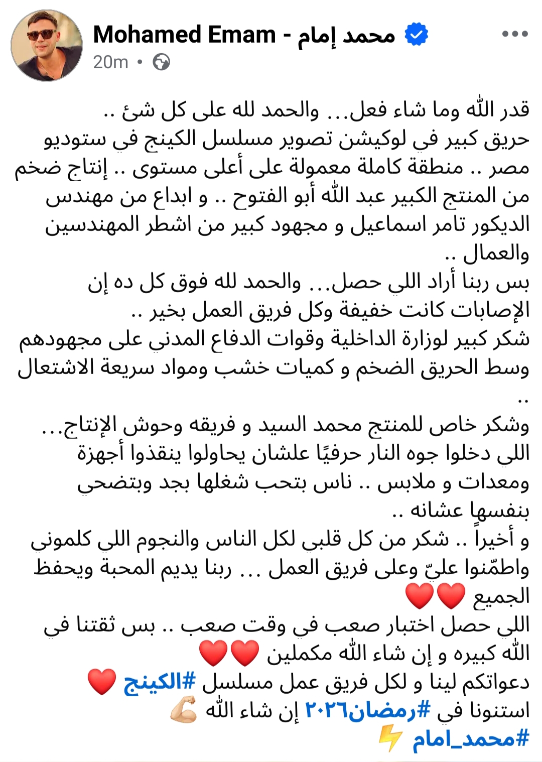 ووجه الفنان محمد إمام، الشكر لوزارة الداخلية وقوات الدفاع المدني على مجهودهم وسط الحريق الضخم وكميات خشب ومواد سريعة الاشتعال، وشكر خاص للمنتج محمد السيد و فريقه وحوش الإنتاج اللي دخلوا جوه النار حرفيًا علشان يحاولوا ينقذوا أجهزة ومعدات وملابس، ناس بتحب شغلها بجد وبتضحي بنفسها عشانه.