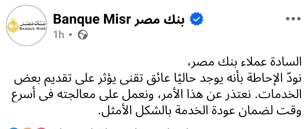 أعلن بنك مصر عن وجود عائق تقني حاليًا يؤثر على تقديم بعض الخدمات المصرفية.