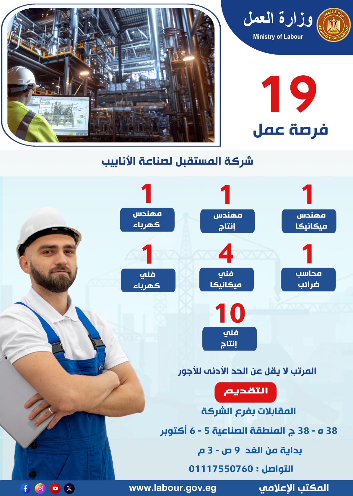 في إطار تنفيذ توجيهات وزير العمل محمد جبران بتوفير فرص عمل لائقة للشباب وتحسين معدلات التشغيل، أعلنت وزارة العمل – بالتعاون مع مديرية قوى عاملة الجيزة والإدارة العامة للتشغيل – عن توفير 19 فرصة عمل جديدة بشركة “المستقبل لصناعة الأنابيب”… وأكدت الوزارة أن هذه الخطوة تأتي ضمن جهودها المستمرة لربط الباحثين عن العمل باحتياجات سوق العمل الفعلية، وتوفير فرص عمل في بيئات مناسبة ومستقرة.