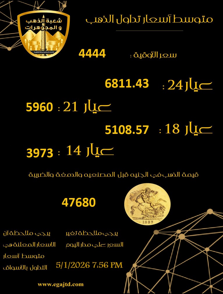 سجلت أسعار الذهب، استقرار ملحوظ في نهاية تعاملات اليوم الإثنين، حسبما ذكرت الشعبة العامة للذهب والمجوهرات بالاتحاد العام للغرف التجارية. وجاءت كالتالي:-