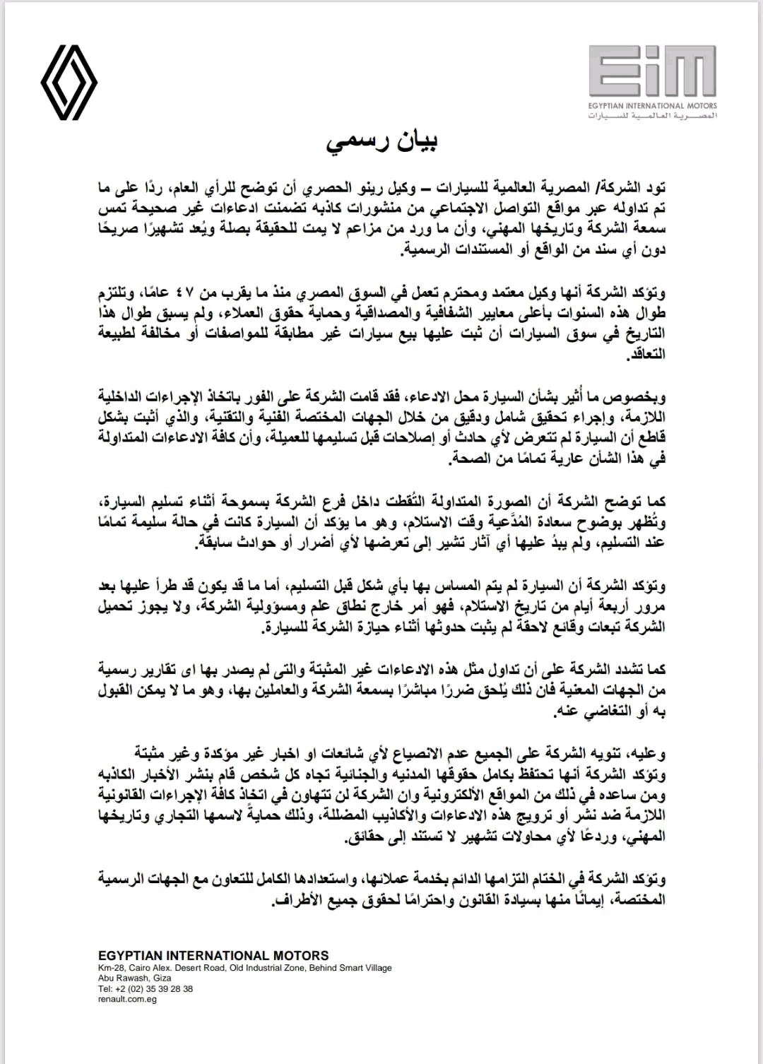 كشفت الشركة المصرية العالمية للسيارات وكيل رينو الحصري للرأي العام، ردًا على ما تم تداوله عبر مواقع التواصل الاجتماعي من منشورات كاذبه تضمنت ادعاءات غير صحيحة تمس سمعة الشركة وتاريخها المهني، وأن ما ورد من مزاعم لا يمت للحقيقة بصلة ويُعد تشهيرًا صريحًا دون أي سند من الواقع أو المستندات الرسمية.