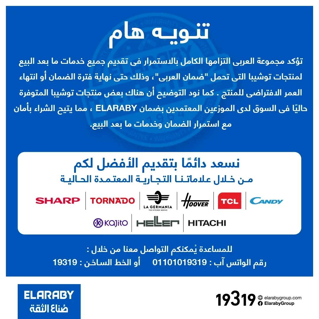 أكدت مجموعة العربي، علي التزامها الكامل بالاستمرار في تقديم جميع خدمات ما بعد البيع لمنتجات توشيبا والتي تحمل ضمان العربي وذلك حتي نهاية فترة الضمان أو انتهاء العمر الافتراضي للمنتج.