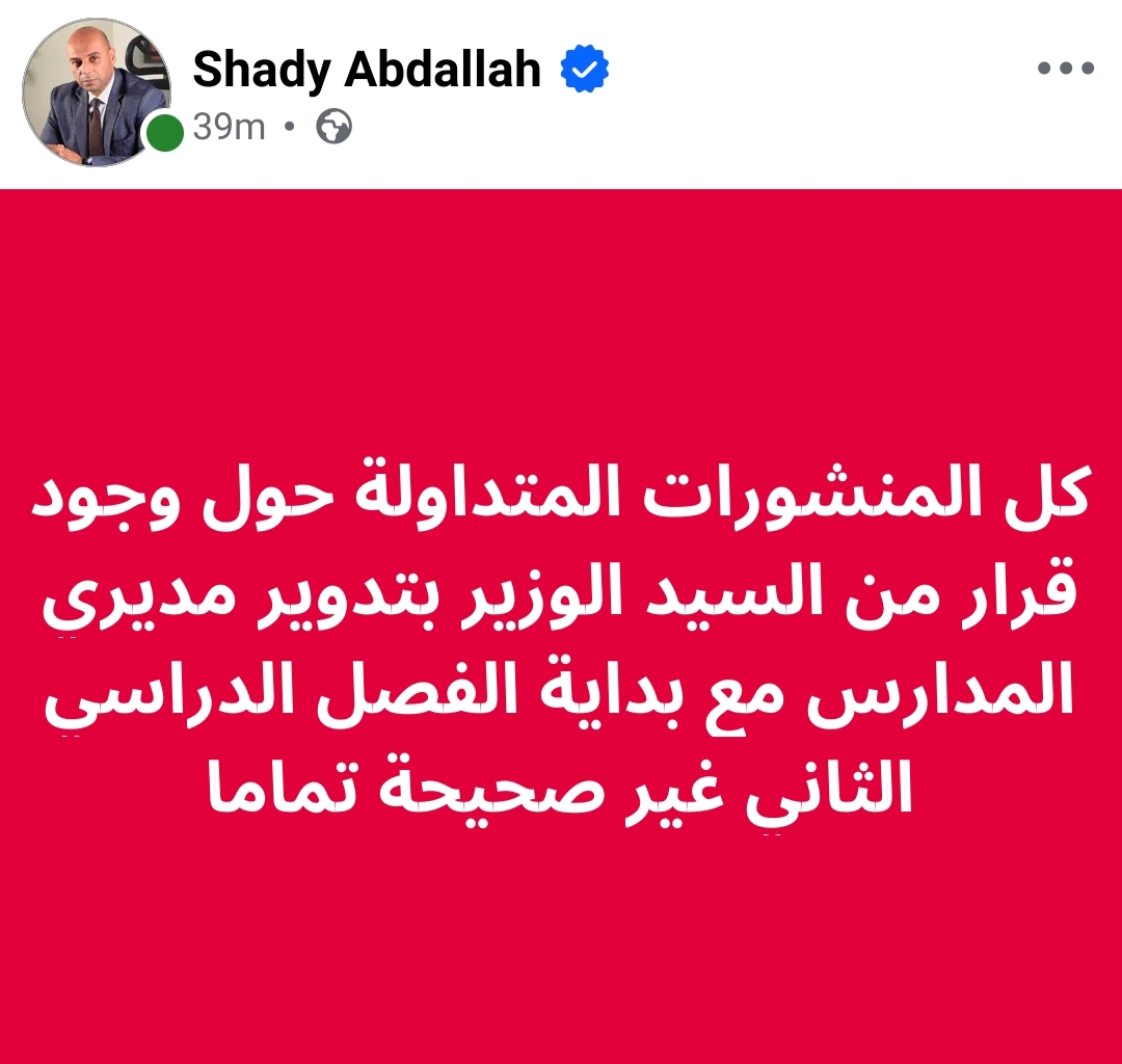 نفى المتحدث الرسمي باسم وزارة التربية والتعليم والتعليم الفني، شادي زلطة، صحة المنشورات المتداولة على مواقع التواصل الاجتماعي، بشأن صدور قرار الوزير محمد عبد اللطيف، بتدوير مديري المدارس مع بداية الفصل الدراسي الثاني.