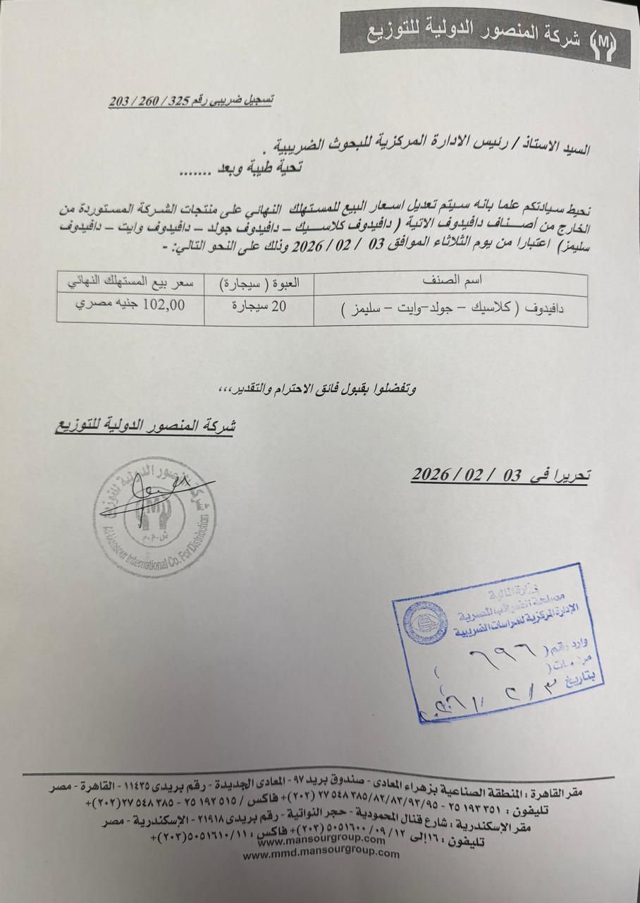 دافيدوف بـ 102 جنيها.. «المنصور الدولية» تقرر رفع أسعار السجائر