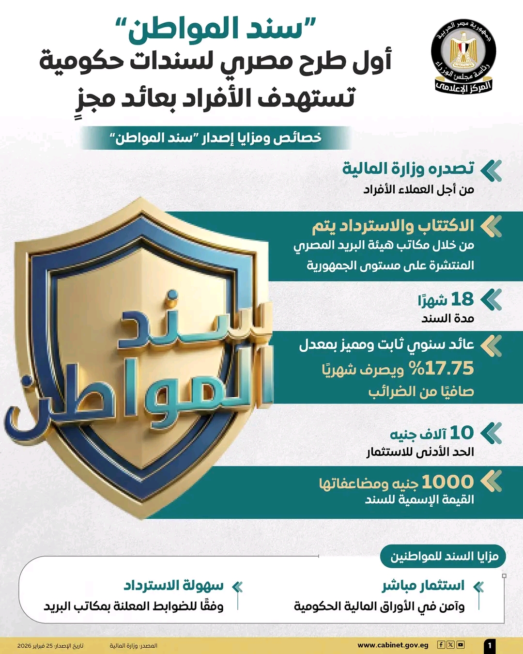 واستعرضت الإنفوجرافات خصائص ومزايا الإصدار، والذي تصدره وزارة المالية من أجل العملاء الأفراد، حيث يتاح الاكتتاب والاسترداد عبر مكاتب هيئة البريد المصري على مستوى الجمهورية، وتبلغ مدة السند 18 شهرًا، بعائد سنوي ثابت ومميز بمعدل 17.75% ويصرف شهريًا صافيًا من الضرائب، فيما يبلغ الحد الأدنى للاستثمار 10 آلاف جنيه، وتبلغ القيمة الإسمية للسند ألف جنيه ومضاعفاتها.
