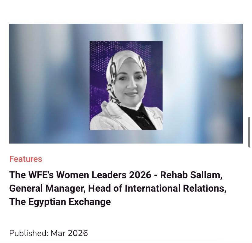 في إطار إعلان الاتحاد العالمي للبورصات لقائمة القيادات النسائية الأكثر تأثيرًا في صناعة أسواق المال عالميًا، والتي صدرت في 4 مارس 2026، ضمّت القائمة الأستاذة رحاب سلام، مدير عام العلاقات الدولية بـ البورصة المصرية، ممثلةً عن البورصة المصرية، وذلك ضمن 20 قيادة تنفيذية من مختلف البورصات حول العالم.