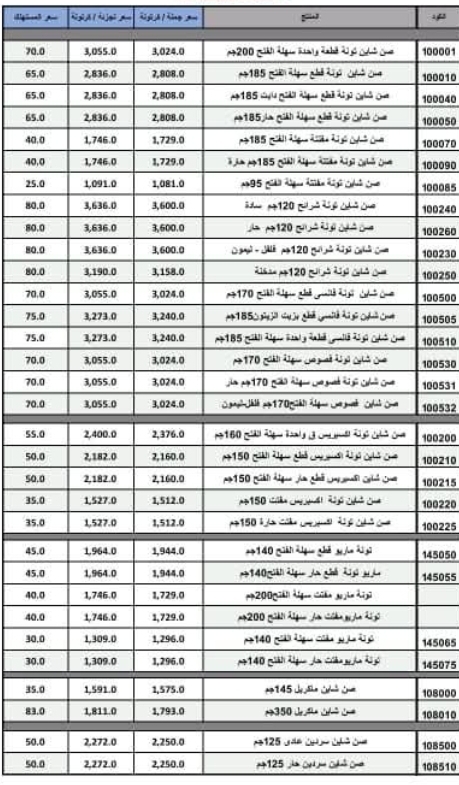 ووفقا لقائمة الاسعار الجديدة، صعد سعر عبوة تونة صن شاين قطعة واحدة سهلة الفتح 200 جرام إلى 70 جنيها، وسعر عبوة تونة صن شاين 185 جرام سهلة الفتح إلى 65 جنيها، وسعر عبوة تونة صن شاين سهلة الفتح 185 جرام حار إلى 65 جنيها.