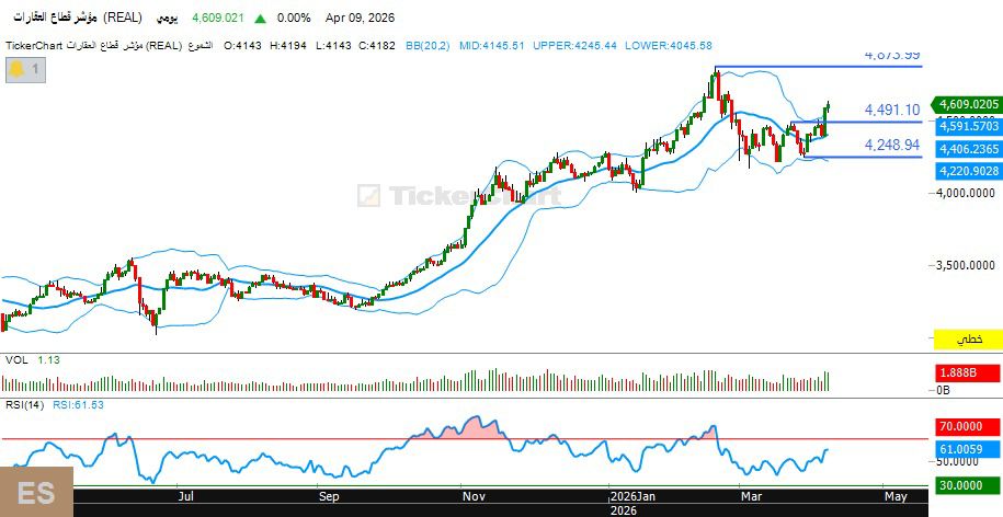 وفيما يتعلق بتحليل قطاع العقارات فقد أغلق مؤشر قطاع العقارات عند مستوى 4609 نقطة، وبالنظر إلى الأداء الفني للمؤشر على الإطار الزمني اليومي نلاحظ أن المؤشر يتحرك داخل اتجاه عام صاعد.