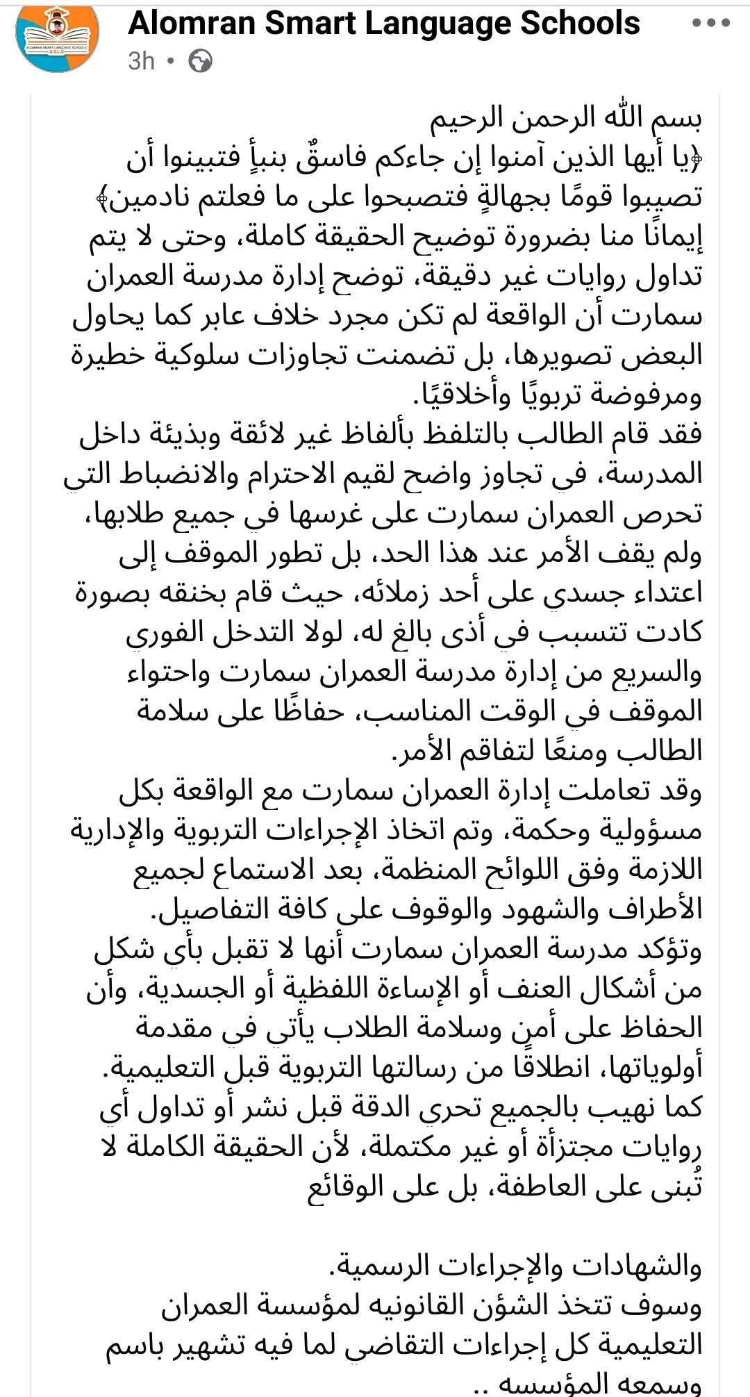 وأكدت مدرسة العمران سمارت، أنها ستتخذ الشؤن القانونيه لمؤسسة العمران التعليمية كل إجراءات التقاضي لما فيه تشهير باسم وسمعه المؤسسة.
